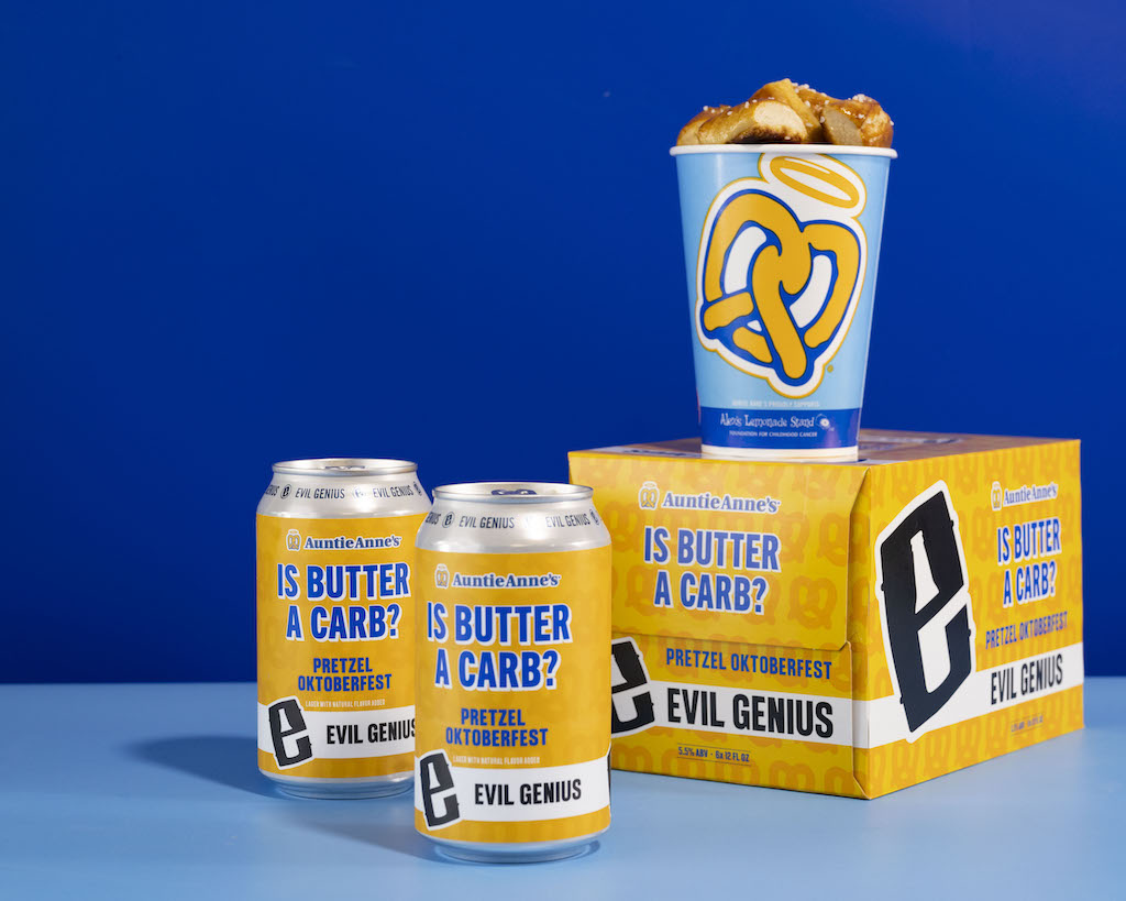Evil Genius Beer Company’s new beer — dubbed Is Butter a Carb? — is brewed with fresh-baked Auntie Anne’s soft pretzels along with German hops and malts. It is the first time Auntie Anne’s iconic pretzels are used to develop a beer that is available for purchase.