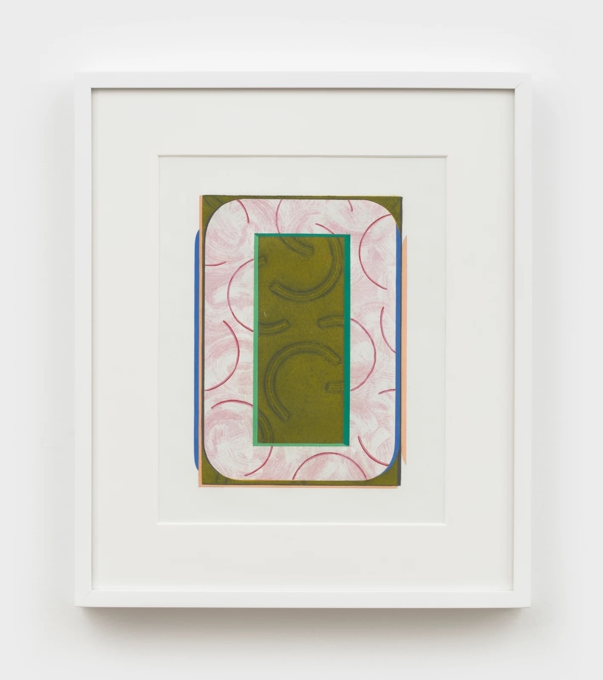Right: “Untitled”, 16 x 14 inches, etching, monoprint, and casein on paper, framed, edition 1 of 1, 2019