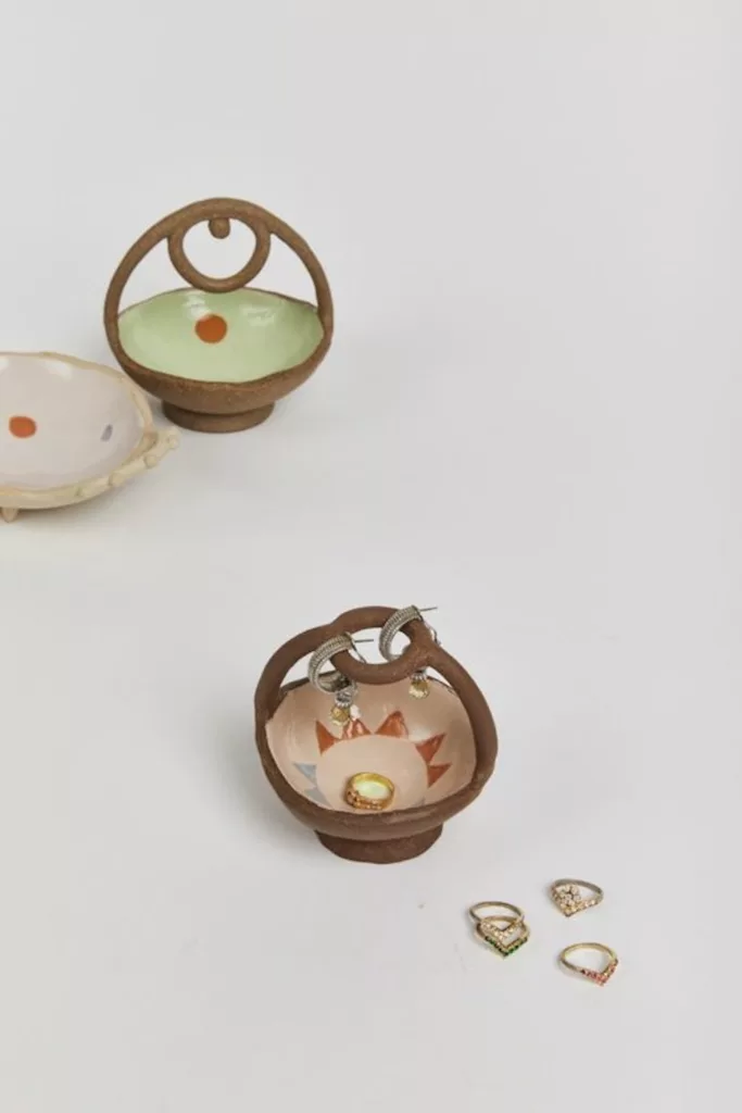 “There is something so elegant in the representation of the third eye through a small red circle. I’ve come to see the single dot as a symbol of the incredible inner power that’s within us all. The Bindi Bowls are playful explorations of finding the third eye. Each bowl is a one-of-a-kind piece. On some, I’ve hand-painted singular circles against colorful backgrounds, positioned so that when you look at the dot of glaze at a certain angle, the rim of the bowl interacts with the dot to form an eye. Other others, eyes are represented in the handles, which are also influenced by the designs of traditional Indian jewelry.” – Leena Muley