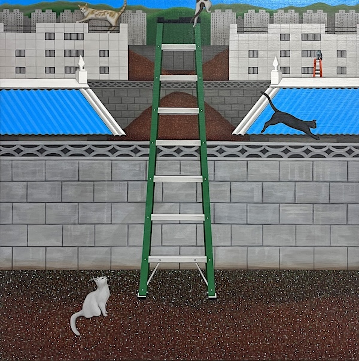 South Korean artist Soyeon Shin creates vibrant acrylic paintings that reflect her inner thoughts and mental landscape. She focuses on capturing the small details of daily life, blending South Korea’s minimalist and industrial architecture with elements of nature. Her work highlights the balance between natural and manufactured environments, inviting viewers to explore her local cityscape.