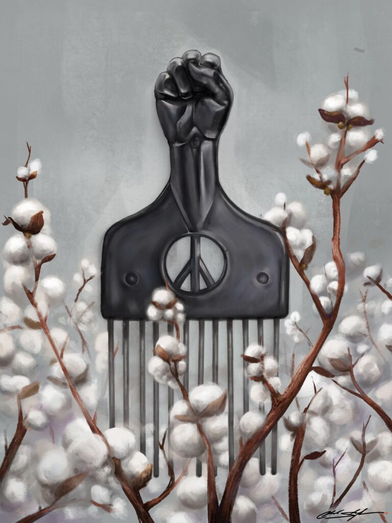 Of his work, Styles writes “Instead of focusing on the hurt and anger of that time I wanted to create something beautiful. The Afro Pick became popular in the 70s. And meant so much more than just a comb for our natural hair. It was a sign of our pride, independence and strength. Juxtaposed against a cotton field as a sign of resilience and uprising, this is the evolution of pick. Know that we have been through many things and have overcome. From powerless to empowered.”