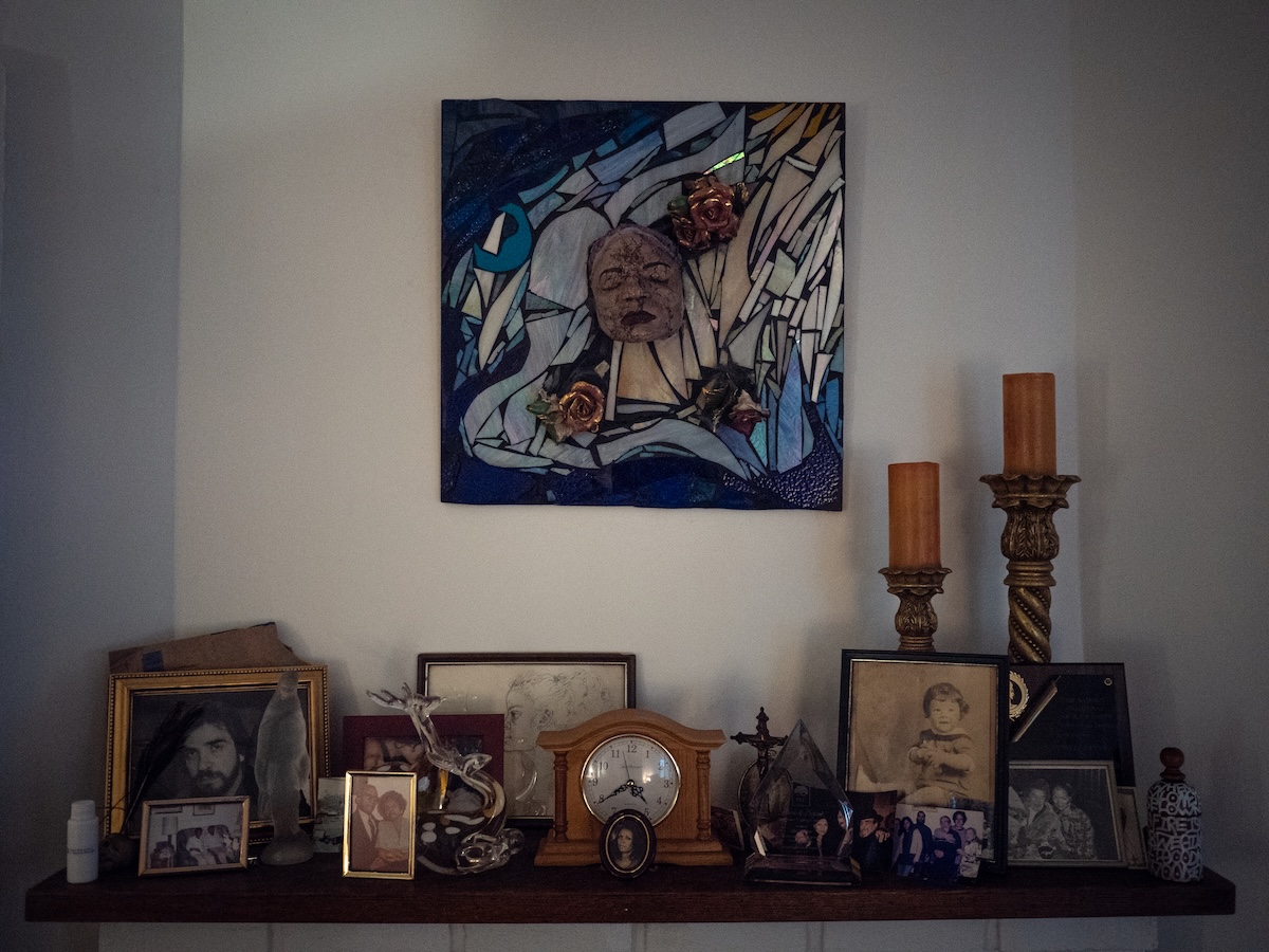 The exhibit pairs Ellen Powell’s vivid, expressive paintings with Ellen Tiberino’s rich, meditative mosaics. But what elevates Semblance and Resemblance is the intimacy: audio recordings of both artists, family artifacts like hats and scarves, and ephemera that offer glimpses into the lived spaces of the Tiberino home, which itself has long served as an open-air museum and neighborhood beacon in West Philly.