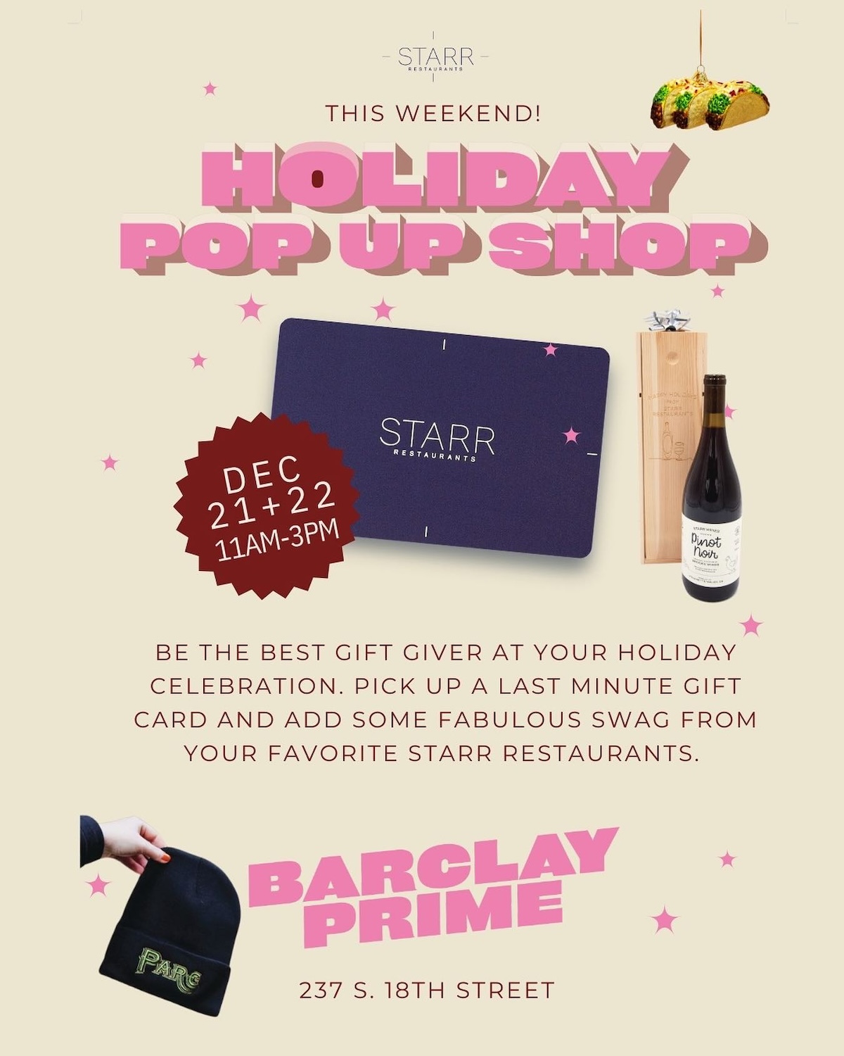 The STARR Holiday Pop-Up event at Barclay Prime on December 21 and 22, from 11 am to 3 pm is a two-day shopping experience for you to snag unique, restaurant-inspired gifts like rigatoni candles, specialty STARR wine, and chic glassware perfect for toasting the new year. Get there early and secure your last-minute gifts while you can.