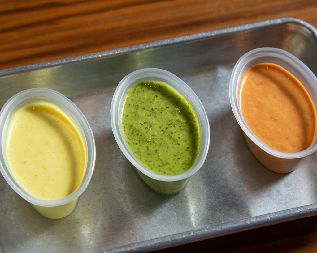 “The variety of sauces give us the ability to cater to the different preferences and palettes of everyone who orders, whether you prefer a sauce with a kick, a creamy aioli type, a rich and smoky flavor, or a little bit of all three,” says Serpico, pointing out that the Green is our take on chimichurri (jalapeño, onion, cilantro, rice vinegar) and is bright and herbaceous. The Red is our smoky chili sauce, and it’s smokey and spicy. The Yellow is a mayonnaise-based sauce with roasted garlic, lemon and turmeric, and it’s creamy yet bright and slightly acidic.