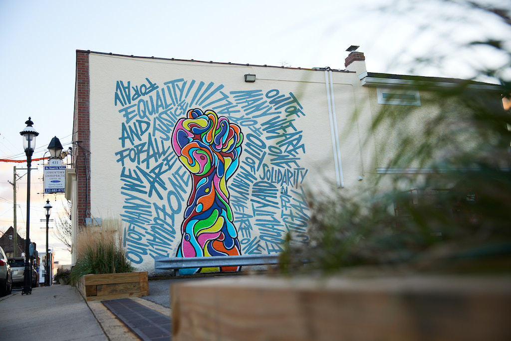 Pancoe asserted, “This mural project is important to Jenkintown Borough because the expression of solidarity and action as symbolized by the multicolored fist and the words of unity in the background speak to the hopes for our community. It is important that we work together to address racism, antisemitism, classism, sexism, and genderism… all the “isms”, and to help folks understand how each of us collectively and as individuals can affect change in the systems that are keeping people down. As Rev. Dr. Martin Luther King said, ‘No one is free until all of us are free.’”