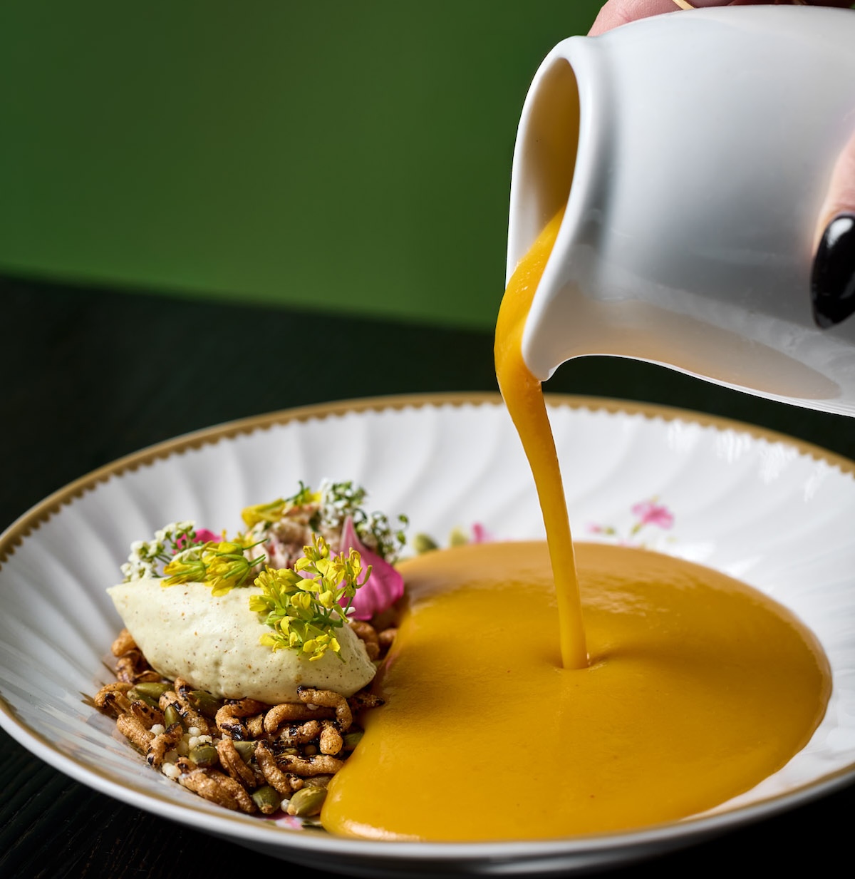 Inside the Kimpton Hotel Palomar, Square 1682 puts a modern spin on fall soup with a Roasted Squash Soup finished with crème fraîche, crispy chicken skin, sage, and green oil. Chef Patrick Czerniak’s creation is balanced, beautiful, and soul-warming.